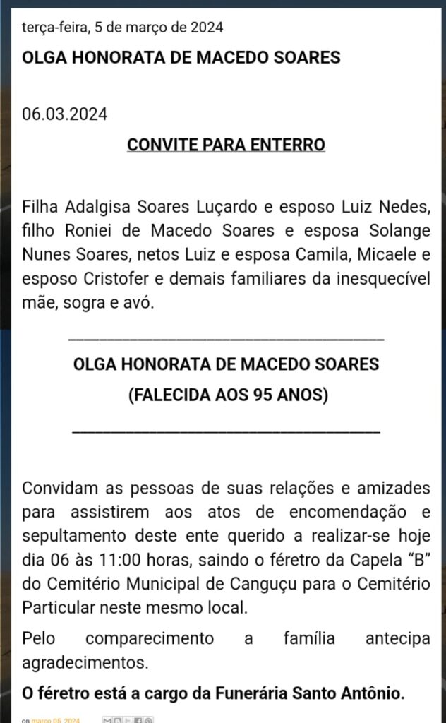 Comunicamos falecimento de Olga Onorata Soares 06/03/2024 01:25 | Atualizada em 06/03/2024 02:01 Ouça agora esse texto Recebi informação através da Dalzija e Nedes Lucardo que a irmã Olga Soares nós deixou nesta as 23 horas. E seu sepultamento será hoje as 11 horas da manhã no cemitério particular Nesta Cidade.